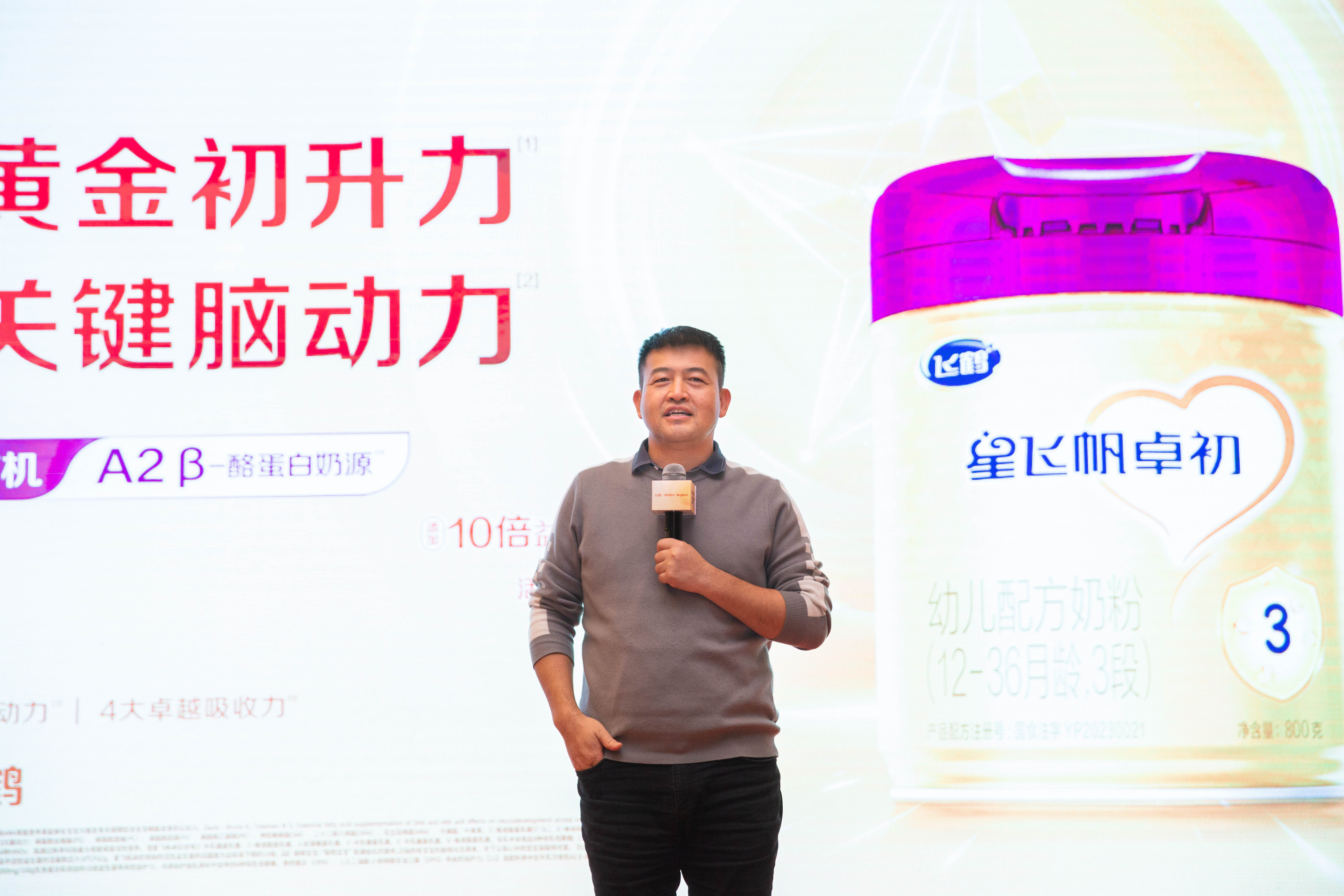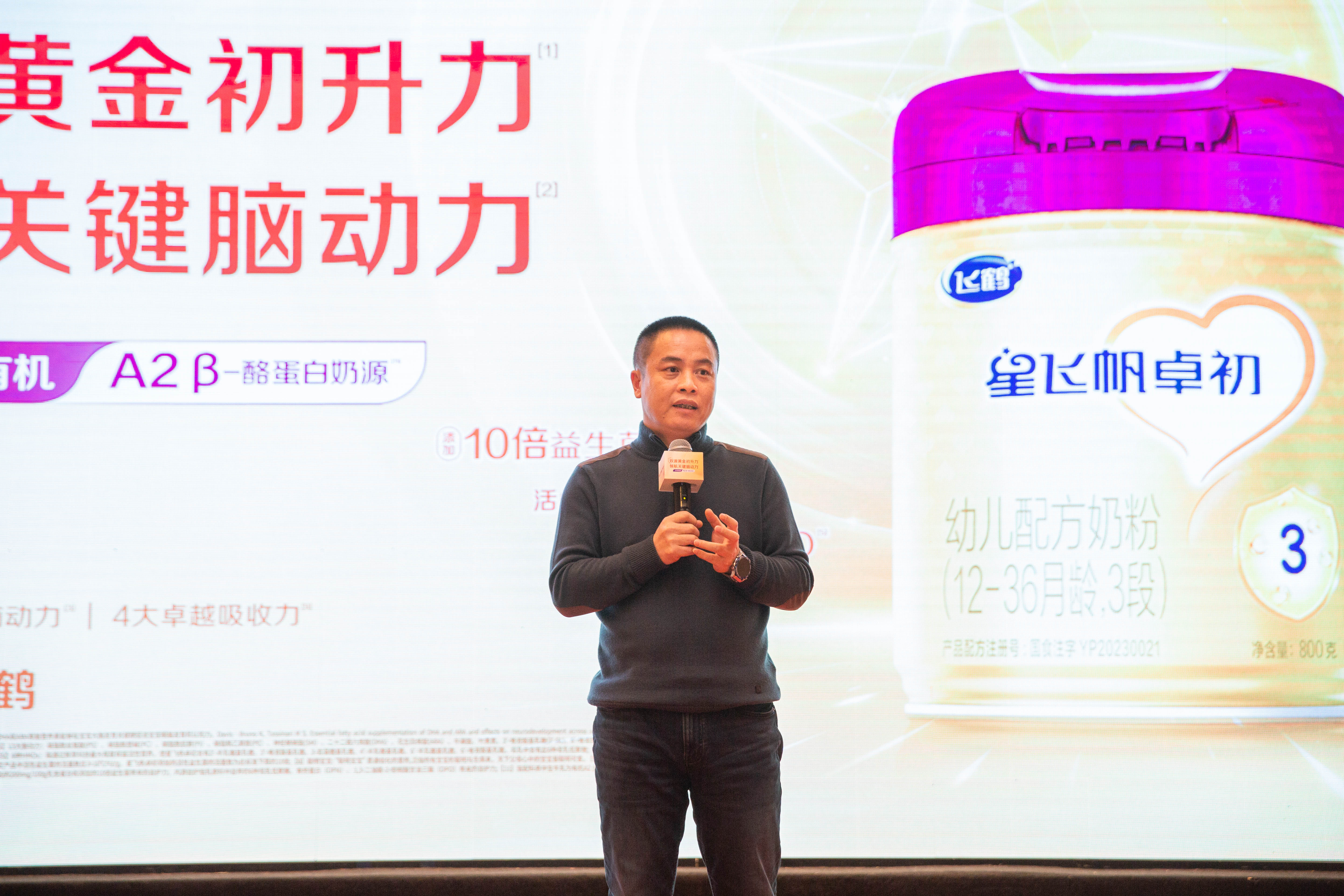 初永辉在讲话中特别强调了飞鹤集团一直以来坚持“以人为本,用户第一”理念,专注宝宝脑力研发,卓初有机A2 β酪蛋白奶粉所含有的丰富核心营养元素,将为宝宝脑部发育提供强有力的支持,他预祝此次新品能够大卖。