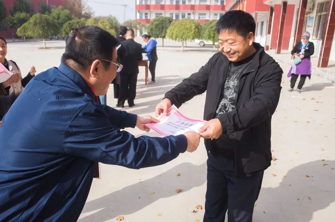 由李校长与校友会代表高庆共同为优秀教师颁发了奖状,并将爱心捐助发放到了教师手中。